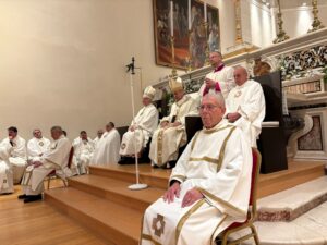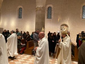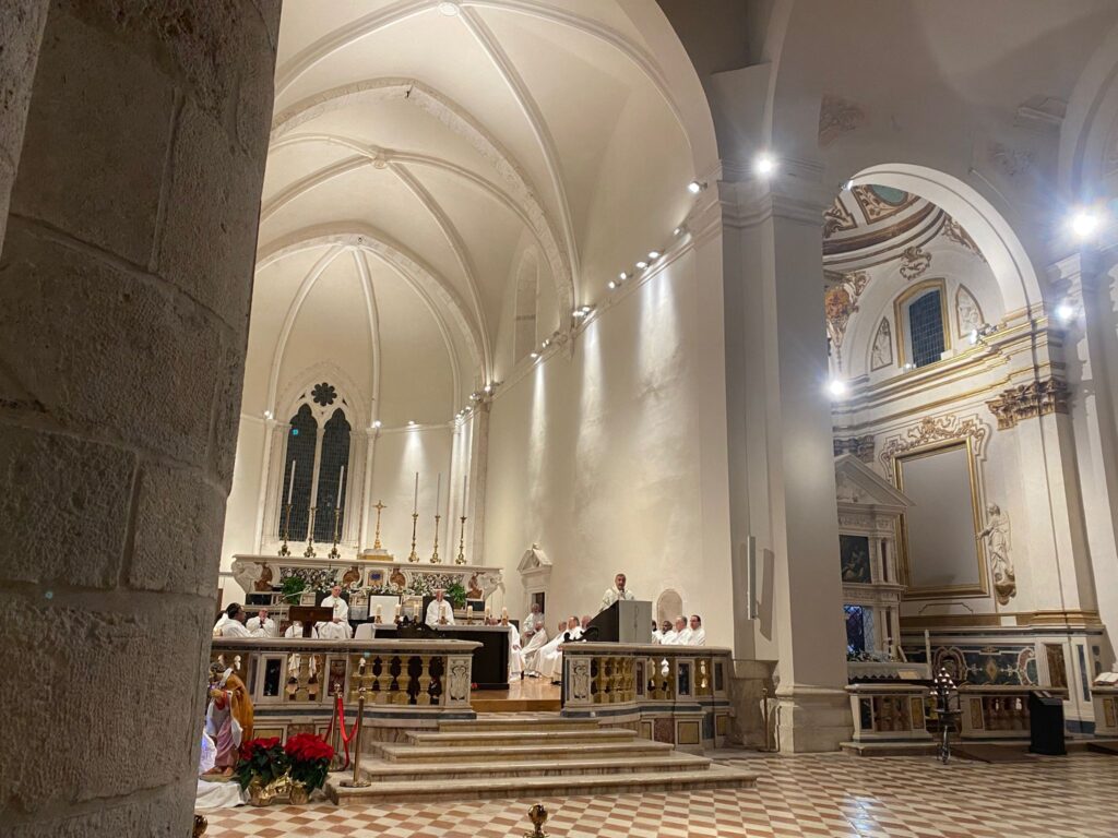 La solenne celebrazione eucaristica, presieduta dall’arcivescovo metropolita aquilano, mons. Antonio D’Angelo, nella basilica di S. Maria di Collemaggio, concelebrata dal nunzio apostolico mons. Orlando Antonini, da una quarantina di presbiteri tra preti diocesani e religiosi e animata dal Coro diocesano di S. Massimo.