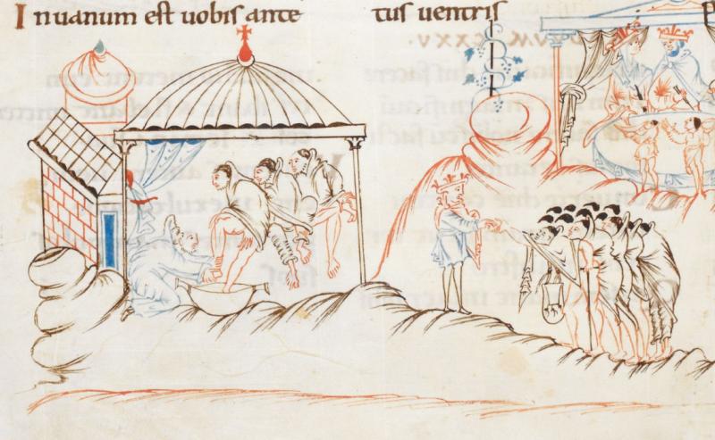 Anche la Regularis Concordia, documento monastico del X secolo di area anglosassone, ma annoverante tradizioni provenienti dall’Europa continentale, testimonia che gli abati lavavano i piedi ai monaci prima della Pasqua. Dopo i Vespri del Giovedì Santo, prima del pasto, l’abate lavava e baciava i piedi di tutti i fratelli della comunità monastica. San Bernardo, poi, attesta che a Cluny era usanza lavare i piedi ai poveri nelle feste principali dell'anno liturgico. Un uso antichissimo che si è conservato ai nostri giorni in molti monasteri. Il Giovedì Santo, agendo come vicario di Cristo nella comunità monastica, l’abate lava e bacia i piedi dei monaci che gli sono stati affidati, esprimendo con il silenzio dei gesti il senso del suo mandato: una vita di amore e di servizio che si svuota di sé, versata ed effusa per i fratelli.
