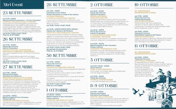 Per l’occasione, la Regione Abruzzo offrirà 500 litri di olio extravergine di oliva 100% italiano, due anfore in ceramica realizzate con tecniche tradizionali aquilane, un contributo al restauro della loggetta di controfacciata della Basilica di Santa Maria degli Angeli e il restauro di due dipinti settecenteschi raffiguranti San Francesco e Santa Chiara. Non mancheranno inoltre le eccellenze dell’agroalimentare abruzzese, gruppi storici, mostre fotografiche e artigianali.